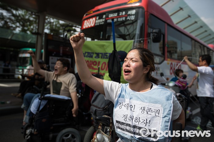 (서울=포커스뉴스) 8일 오후 서울 영등포구 여의도 환승센터 앞에서 경기장애인차별철폐공동투쟁단원들이 장애인 이동권 보장을 촉구하며 경기도행 버스를 막아서고 구호를 외치고 있다.