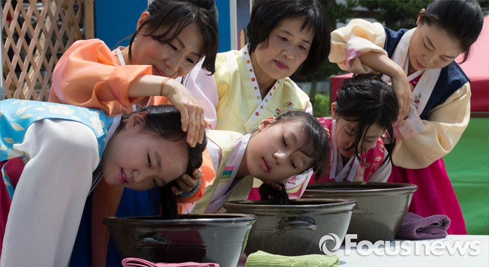 (대전=포커스뉴스) 9일 오후 (음력5월5일) 단오를 맞아 대전 동구 쌍청당공원에서 열린 판암골 단오한마당에서 한복입은 여학생들이 창포 삶은물에 머리를 감고 있다.