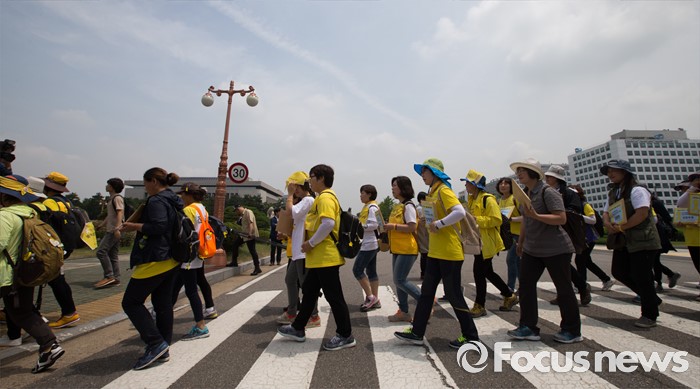 (서울=포커스뉴스) 8일 오전 서울 여의도 국회 앞에서 4.16가족협의회와 4.16연대 관계자들이 세월호 진상규명 특별법 개정 입법청원 기자회견 후 입법청원서를 들고 국회 본청 앞으로 향하고 있다.
