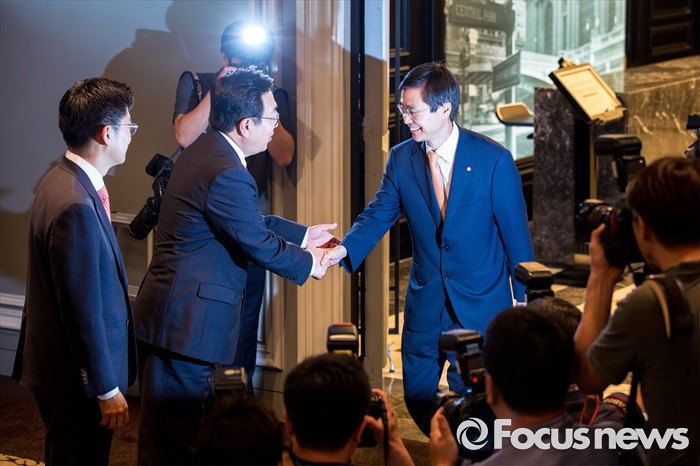 (서울=포커스뉴스) 조경태(오른쪽) 새누리당 의원과 서병수 부산광역시장이 8일 오전 서울 여의도 켄싱턴호텔에서 열린 '새누리당 부산시당-부산광역시 당정 협의'에 참석해 악수 하고 있다.