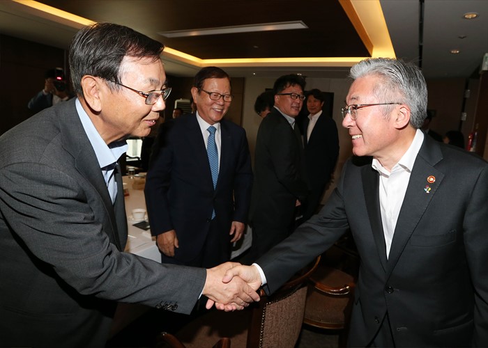 (서울=포커스뉴스) 9일 서울 중구 프레스센터에서 열린 광고업계 간담회에서 김종덕 문체부 장관이 이순동 한국광고총연합회 회장과 인사를 나누고 있다. <사진제공=문화체육관광부>
