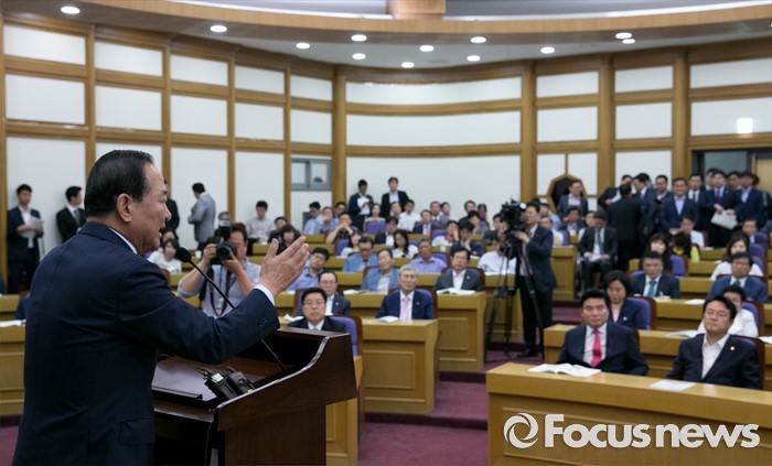 (서울=포커스뉴스) 8일 오전 서울 여의도 국회 의원회관에서 열린 국가미래전략포럼(일명 알파포럼) 창립총회 및 강연회에 참석한 서청원 새누리당 전 최고위원이 축사를 하고 있다. 이날 정 원내대표와 서 전 최고위원은 국회의장직을 야당에 양보한다는 뜻을 밝혔다.