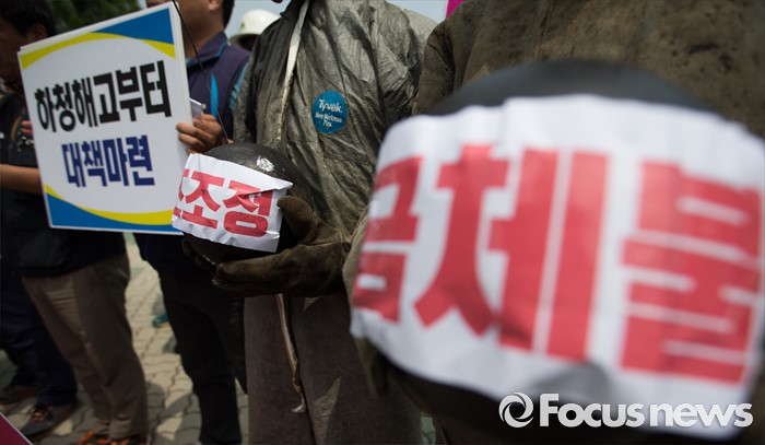 (서울=포커스뉴스) 8일 오전 서울 여의도 국회 앞에서 민주노총 금속노조 조합원들와 조선소 하청노동자들이 구조조정 중단과 고용안전 대책을 요구하는 기자회견을 하고 있다.