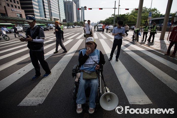(서울=포커스뉴스) 8일 오후 서울 영등포구 여의도 환승센터 앞에서 경기장애인차별철폐공동투쟁단원들이 장애인 이동권 보장을 촉구하며 경기도행 버스를 막아서고 구호를 외치고 있다.