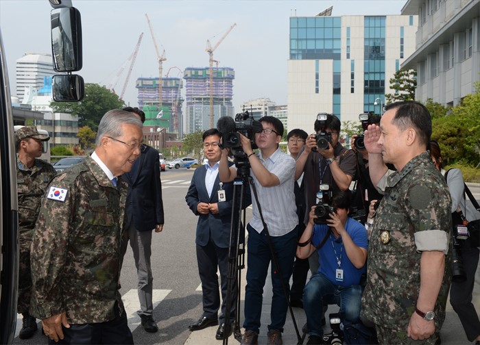 (서울=포커스뉴스) 김종인(왼쪽) 더불어민주당 비대위 대표가 8일 오전 서울 용산구 합동참모본부를 방문해 이순진 합참의장으로부터 거수경례를 받고 있다.<사진제공=더불어민주당>