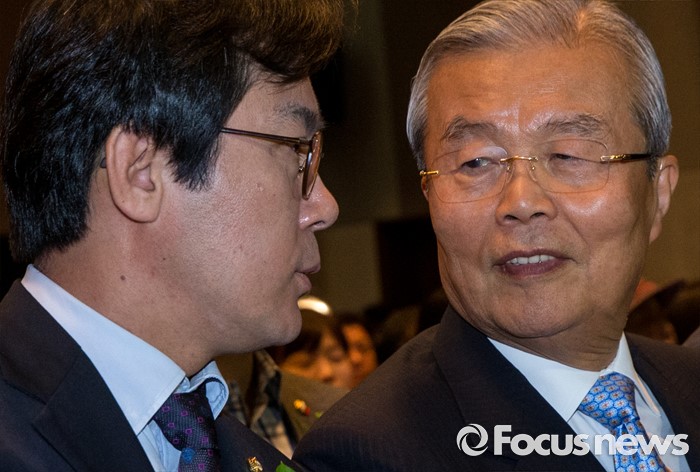 (서울=포커스뉴스) 10일 오전 서울 중구 프레스센터에서 열린 6.10 민주항쟁 제29주년 기념식에 참석한 김영우(왼쪽) 새누리당 비대위원과 김종인 더불어민주당 비대위 대표가 대화하고 있다.