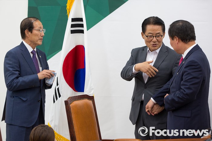 (서울=포커스뉴스) 박지원(가운데) 국민의당 원내대표가 10일 오후 서울 여의도 국회에서 이원종(왼쪽) 대통령비서실장, 김재원 청와대 정무수석과 면담을 마친 뒤 배웅 하고 있다.