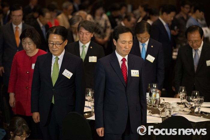 (서울=포커스뉴스) 9일 오후 서울 여의도구 63빌딩 그랜드볼룸에서 열린 '6.15 남북정상회담 16주년 기념식'에 참석한 정치인들이 국민의례를 하고 있다. 왼쪽부터 심상정 정의당 대표, 박지원 국민의당 원내대표, 안철수 국민의당 공동대표, 우상호 더불어민주당 원내대표, 천정배 국민의당 공동대표, 노회찬 정의당 원내대표.