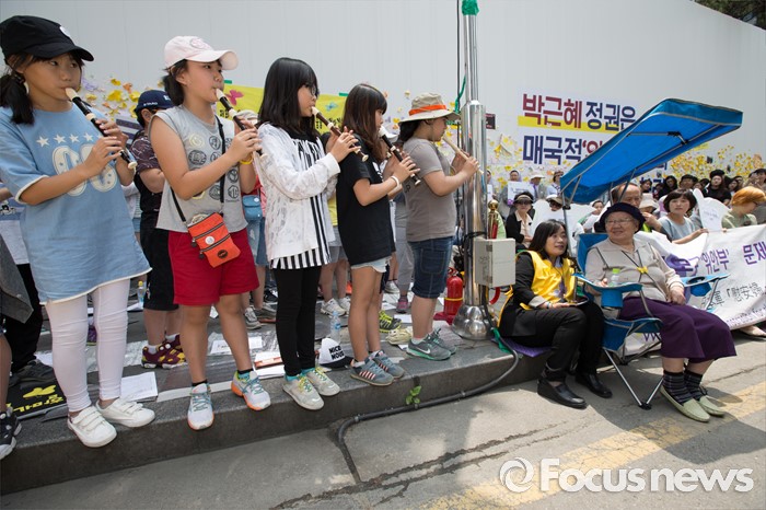 (서울=포커스뉴스) 8일 오후 서울 종로구 옛 일본대사관 앞에서 열린 제 1234차 일본군 위안부 문제해결을 위한 정기 수요시위에 참석한 초등학교 학생들이 길원옥 할머니 앞에서 리코더 공연을 선보이고 있다.