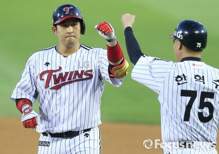 (서울=포커스뉴스) 8일 서울 잠실구장에서 열린 2016 프로야구 삼성-LG 경기 3회말 2사 만루에서 LG 유강이 2타점 좌전 안타를 치고 한혁수 코치와 주먹을 마주치고 있다.