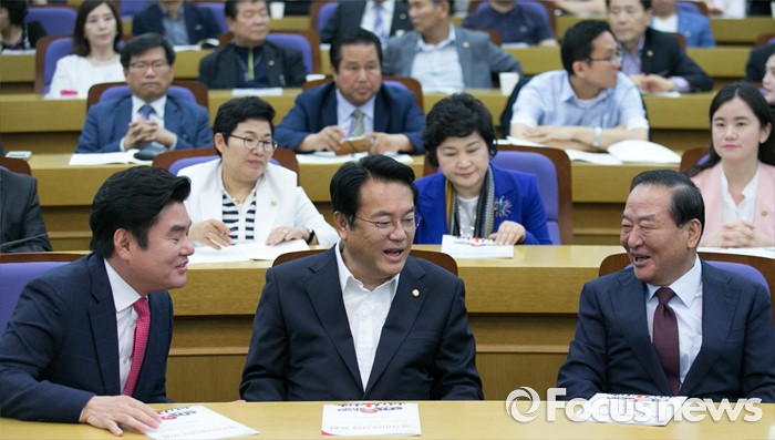 (서울=포커스뉴스) 8일 오전 서울 여의도 국회 의원회관에서 열린 국가미래전략포럼(일명 알파포럼) 창립총회 및 강연회에 참석한 정진석(가운데) 새누리당 원내대표와 원유철(왼쪽) 전 원내대표, 서청원 전 최고위원이 대화하고 있다. 이날 정 원내대표와 서 전 최고위원은 국회의장직을 야당에 양보한다는 뜻을 밝혔다.