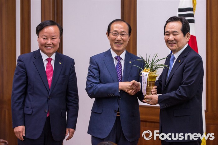 (서울=포커스뉴스) 이원종(가운데) 대통령비서실장과 김재원(왼쪽) 청와대 정무수석이 10일 오전 서울 여의도 국회에서 정세균 국회의장을 예방해 박근혜 대통령의 축하 난을 전달 하고 있다.