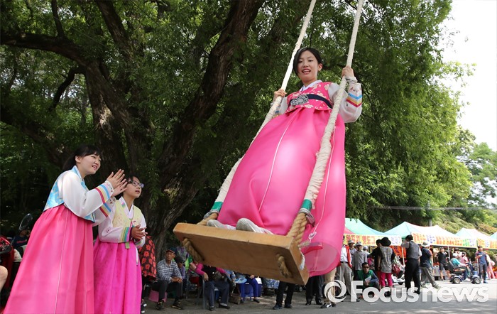 (대전=포커스뉴스) 9일 오후 (음력5월5일) 단오를 맞아 대전 동구 쌍청당공원에서 열린 판암골 단오한마당에서 한복입은 여학생이 그네뛰기를 하고 있다