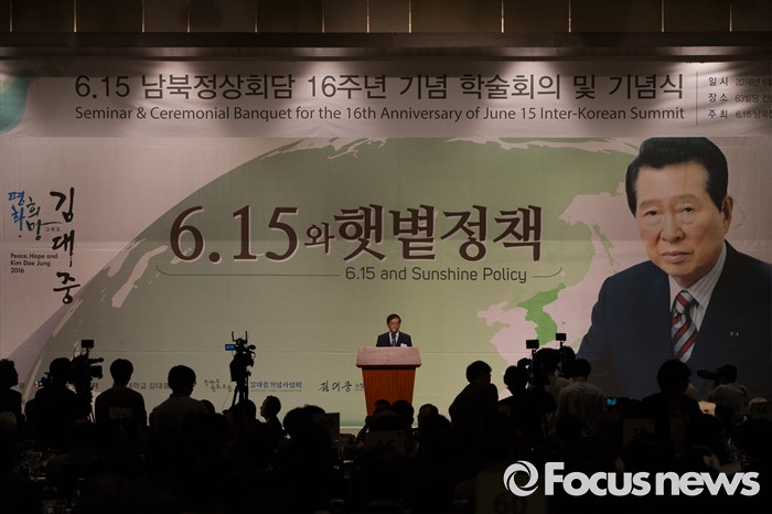 (서울=포커스뉴스) 9일 오후 서울 여의도구 63빌딩 그랜드볼룸에서 열린 '6.15 남북정상회담 16주년 기념식'에 참석한 박원순 서울시장이 인사말을 하고 있다.