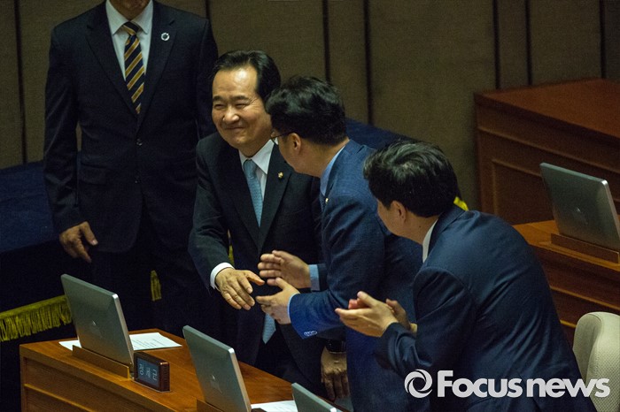 (서울=포커스뉴스) 9일 오후 서울 여의도 국회에서 열린 본회의에서 20대 국회 전반기 국회의장으로 선출된 정세균 더불어민주당 의원이 수락 연설을 하기 위해 연단으로 이동하며 동료의원들에게 축하 받고 있다.