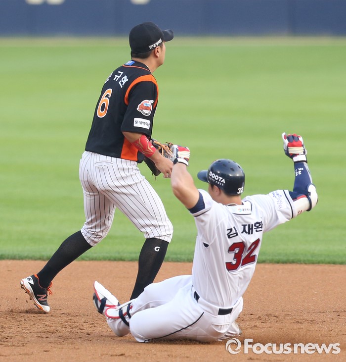 | △ 2루에서 세이프되는 두산 김재환 |