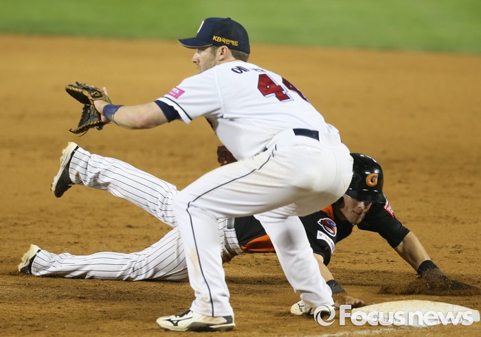 (서울=포커스뉴스) 10일 서울 잠실구장에서 열린 2016프로야구 롯데-두산 경기 8회초 1사 1,3루에서 롯데 1루주자 아두치가 두산 정재훈의 견제구에 슬라이딩하며 귀루하고 있다.