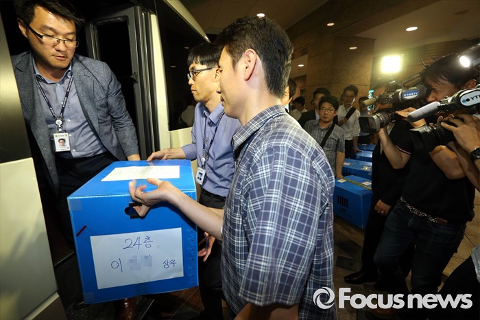 (서울=포커스뉴스) 10일 오후 서울 중구 소공동 롯데호텔에서 검찰 수사관들이 롯데그룹 정책본부 등 계열와 신동빈 롯데그룹 회장 집무실에서 압수수색한 서류를 화물차에 싣고 있다.