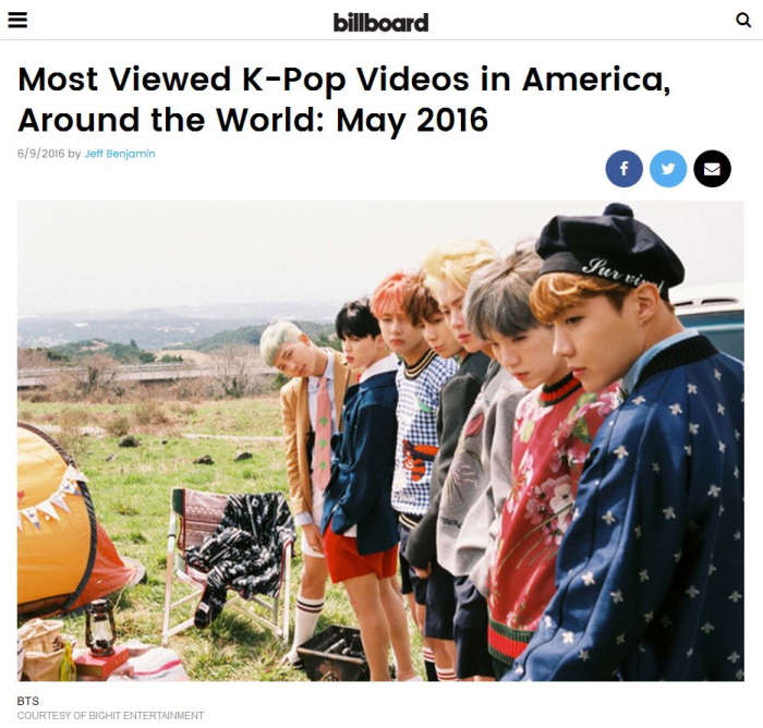 지난 9일(현지 시각) 미국 빌보드는 ‘2016년 5월, 미국 및 전세계에서 가장 많이 본 K-POP 뮤직비디오(Most Viewed K-Pop Videos in America, Around the World: May 2016)’라는 제목의 칼럼을 게재하고 5월 한 달 간 유튜브를 기반으로 한 K-POP 뮤직비디오 최다 조회 수 순위를 발표했다.