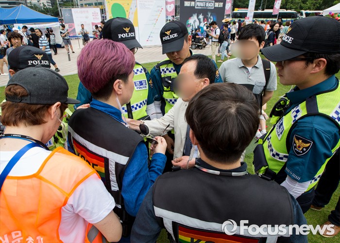 (서울=포커스뉴스) 11일 오후 서울광장에서 열린 제17회 퀴어문화축제에서 동성애를 반대하는 한 시민이 관계자와 충돌을 일으키고 있다.