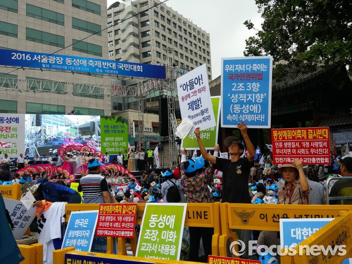 한국기독교총연합회·한국교회연합·한국장로총연합회 등 보수 기독교계는 이날 오후 2시부터 퀴어문화 축제가 열리는 서울광장 건너편인 덕수궁 대한문 광장에서 '서울광장 동성애 퀴어축제반대 국민대회'를 열고 △동성애 차별 금지법 추진 중단 △탈 동성애 인권 보호법 제정 △주민인권조례 및 학생인권조례 개정 △인권보도준칙 폐기 등을 요구했다.
