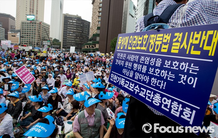 (서울=포커스뉴스) 11일 오후 서울 중구 대한문 앞에서 열린 '2016 서울광장 동성애축제 반대 국민대회'에서 참석자들이 동성애를 반대하는 손팻말을 들고 있다.