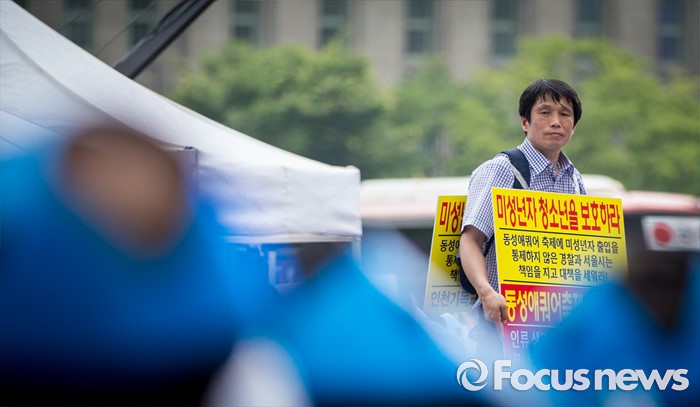 (서울=포커스뉴스) 11일 오후 서울 중구 대한문 앞에서 열린 '2016 서울광장 동성애축제 반대 국민대회'에서 한 참석자가 동성애를 반대하는 손팻말을 들고 있다.