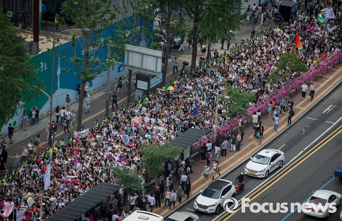 (서울=포커스뉴스) 11일 오후 제17회 퀴어문화축제 참가자들이 서울광장을 출발해 을지로 일대를 지나며 퀴어퍼레이드를 벌이고 있다.