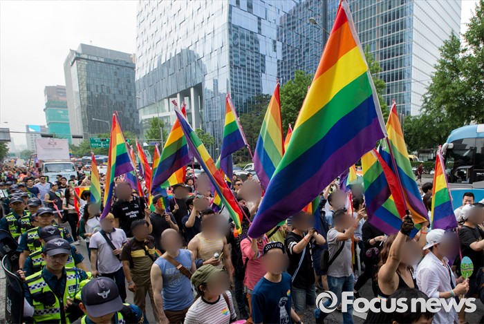 (서울=포커스뉴스) 11일 오후 제17회 퀴어문화축제 참가자들이 서울광장을 출발해 을지로일대를 지나며 퀴어퍼레이드를 벌이고 있다.