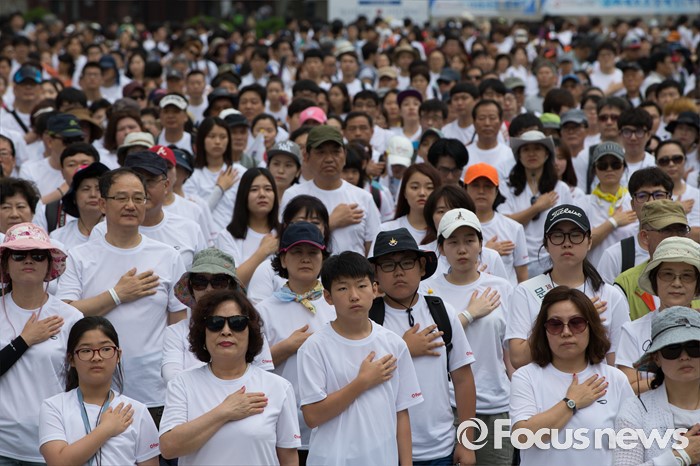 (서울=포커스뉴스) 12일 오전 서울 중구 서울시청 광장에서 열린 '제7회 나라사랑 고궁걷기 대회'에 참가한 시민들이 국민의례를 하고 있다.