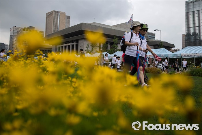 (서울=포커스뉴스) 12일 오전 서울 중구 서울시청 광장에서 열린 '제7회 나라사랑 고궁걷기 대회'에 참가한 시민들이 경복궁을 향해 걷고 있다.