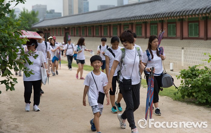 (서울=포커스뉴스) 12일 오전 서울 중구 서울시청 광장에서 열린 제 7회 나라사랑 고궁걷기 대회에 참가한 시민들이 경복궁을 지나 창경궁을 향해 걷고 있다.