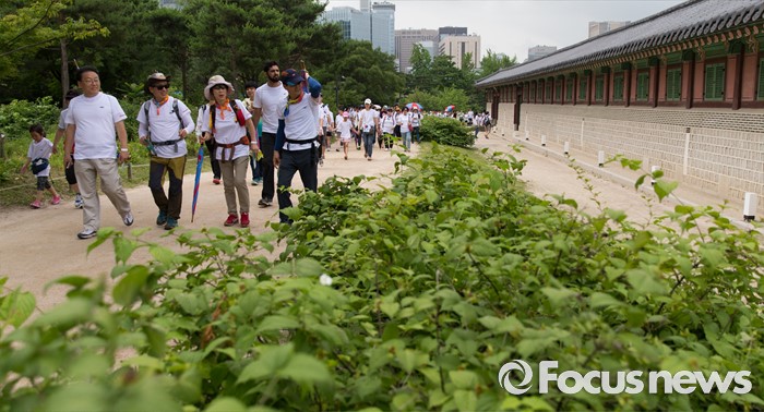 (서울=포커스뉴스) 12일 오전 서울 중구 서울시청 광장에서 열린 제 7회 나라사랑 고궁걷기 대회에 참가한 시민들이 경복궁을 지나 창경궁을 향해 걷고 있다.