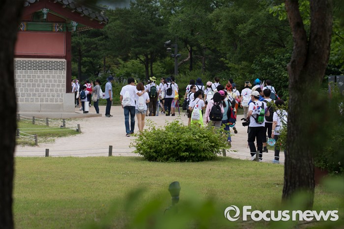 (서울=포커스뉴스) 12일 오전 서울 중구 서울시청 광장에서 열린 제 7회 나라사랑 고궁걷기 대회에 참가한 시민들이 경복궁을 지나 창경궁을 향해 걷고 있다.