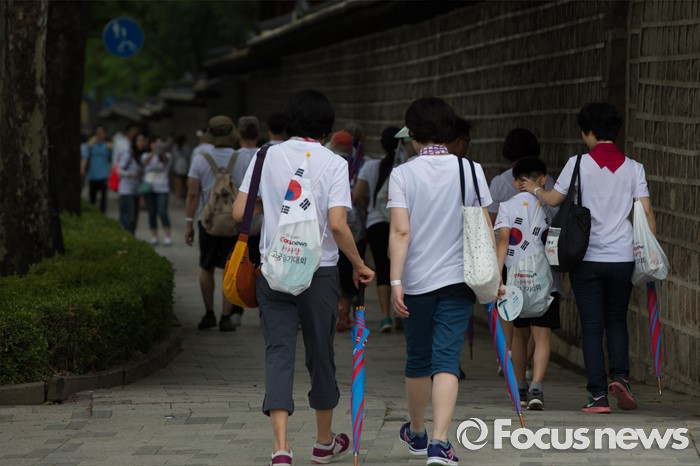 (서울=포커스뉴스) 12일 오전 서울 종로구 창경궁에서 '제7회 나라사랑 고궁걷기 대회'에 참가한 시민들이 고궁을 둘러보며 걷고 있다.