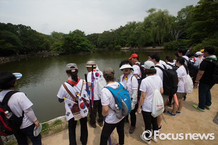 (서울=포커스뉴스) 12일 오전 서울 종로구 창경궁에서 '제7회 나라사랑 고궁걷기 대회'에 참가한 시민들이 고궁을 둘러보며 걷고 있다.