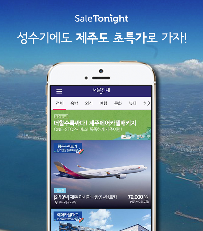 세일투나잇은 국내숙박뿐 아니라 해외숙박, 영화, 공연, 외식 등을 50~80% 할인된 가격에 판매는 종합 타임커머스 서비스다. 제주에서도 '세일투나잇 앱' 하나만으로 항공, 렌트, 숙박을 원스톱으로 이용할 수 있다.