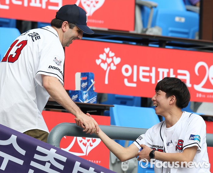 (서울=포커스뉴스) 12일 마크 리퍼트 주한 미국대사가 2016 프로야구 롯데-두산 경기가 열린 서울 잠실구장을 찾아 야구 팬과 악수하고 있다.
