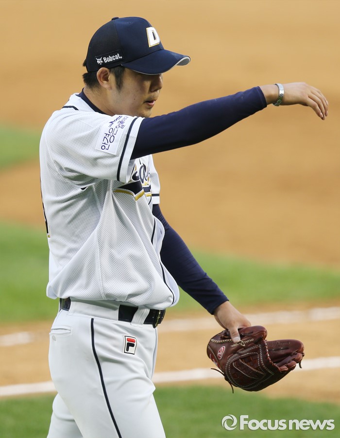 (서울=포커스뉴스) 12일 서울 잠실구장에서 열린 2016 프로야구 롯데-두산 경기에서 두산 선발투수 장원준이 8회 수비를 마치고 덕아웃으로 들어가고 있다.
