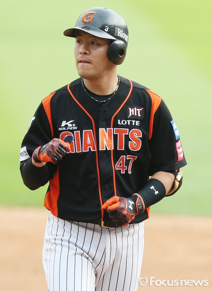 (서울=포커스뉴스) 12일 서울 잠실구장에서 열린 2016 프로야구 롯데-두산 경기 4회초 2사 2루에서 롯데 강민호가 2루주자 황재균을 불러 들이는 중전 안타를 치고 주먹을 불끈 쥐고 있다.
