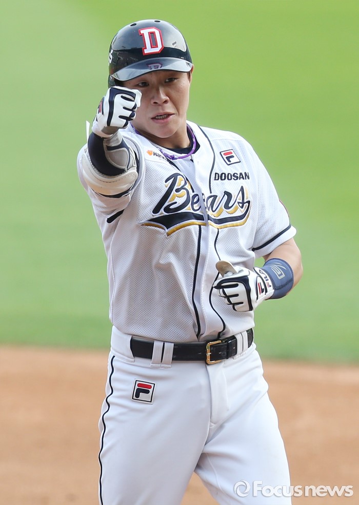 (서울=포커스뉴스) 12일 서울 잠실구장에서 열린 2016 프로야구 롯데-두산 경기 4회말 무사 만루에서 두산 박세혁이 1타점 좌전 안타를 치고 1루에서 어퍼컷 세레머니를 하며 기뻐하고 있다.