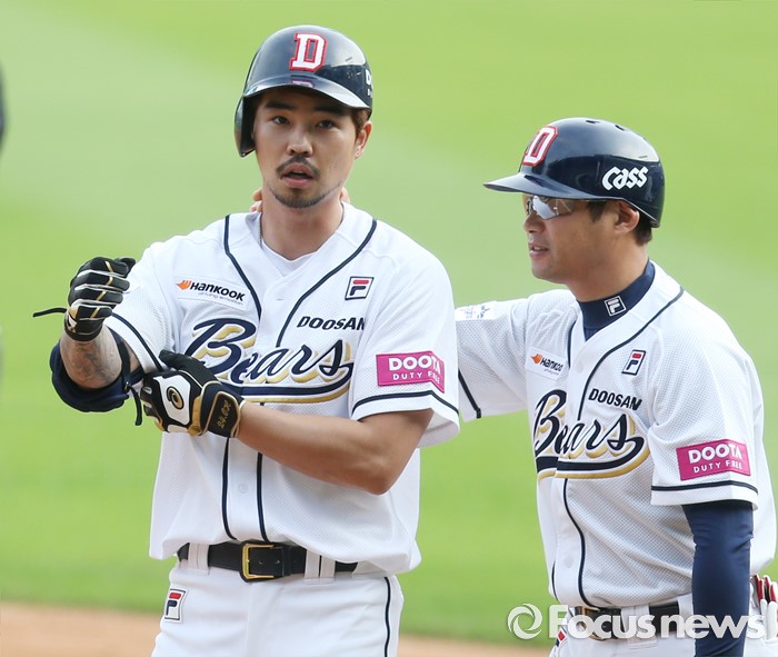 (서울=포커스뉴스) 12일 서울 잠실구장에서 열린 2016 프로야구 롯데-두산 경기 4회말 무사 1,2루에서 두산 오재원이 내야안타를 쳐 동점을 만들고 강동우 코치의 축하를 받고 있다.