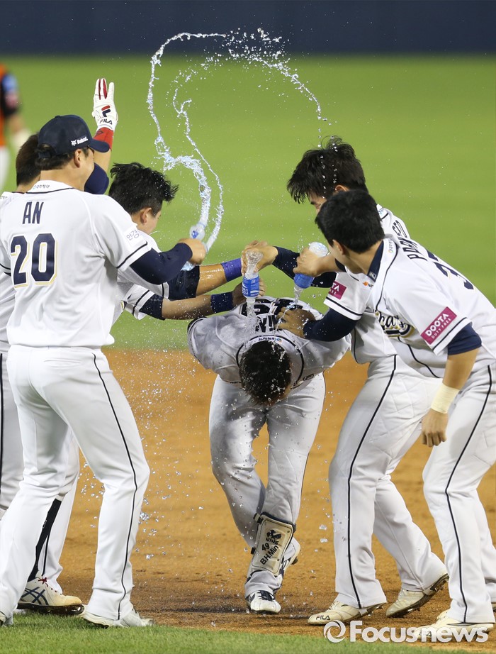 (서울=포커스뉴스) 12일 서울 잠실구장에서 열린 2016 프로야구 롯데-두산 경기에서 연장 11회말 끝내기 2루타를 친 두산 민병헌에게 동료들이 축하의 물세례를 하고 있다.