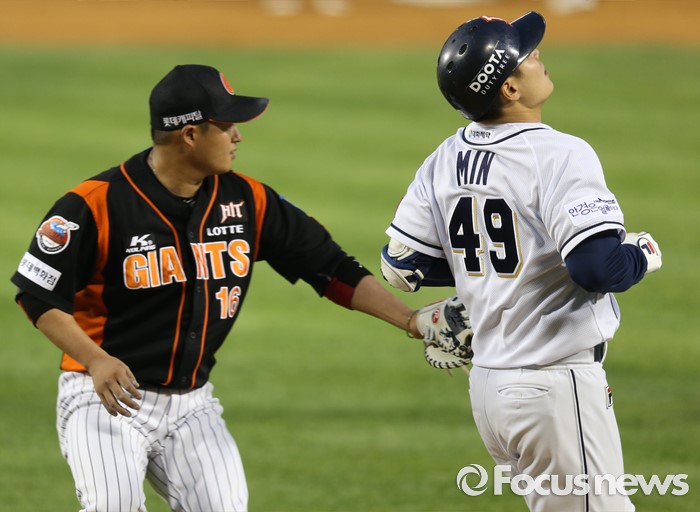 (서울=포커스뉴스) 12일 서울 잠실구장에서 열린 2016 프로야구 롯데-두산 경기 9회말 무사 1루에서 두산 민병헌이 희생번트를 대고 롯데 1루수 손용석에게 태그아웃되고 있다.