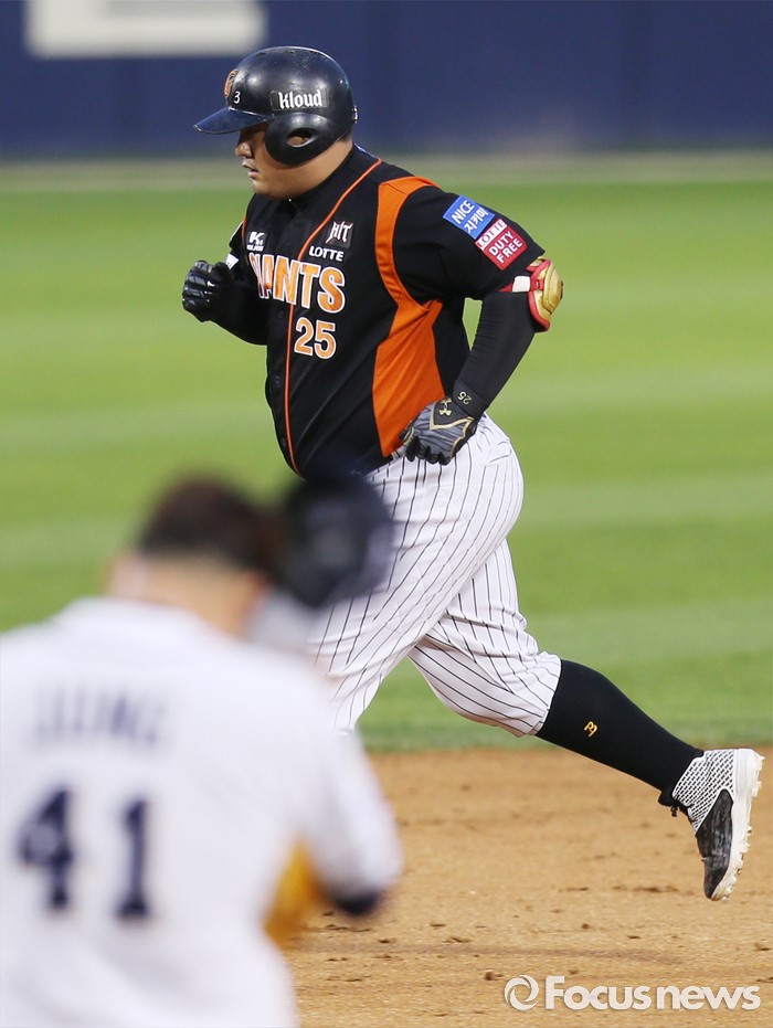 (서울=포커스뉴스) 12일 서울 잠실구장에서 열린 2016 프로야구 롯데-두산 경기 9회초 2사 2루에서 롯데 최준석이 동점 우월 홈런을 치고 그라운드를 달리고 있다.