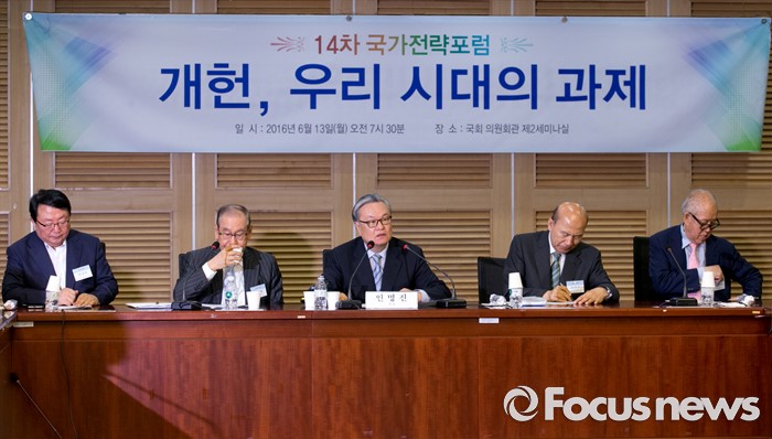 (서울=포커스뉴스) 13일 오전 서울 여의도 국회 의원회관에서 '개헌, 우리 시대의 과제'란 주제로 열린 14차 국가전략포럼에 참석한 인명진(왼쪽 세번째) 목사가 발언하고 있다.
