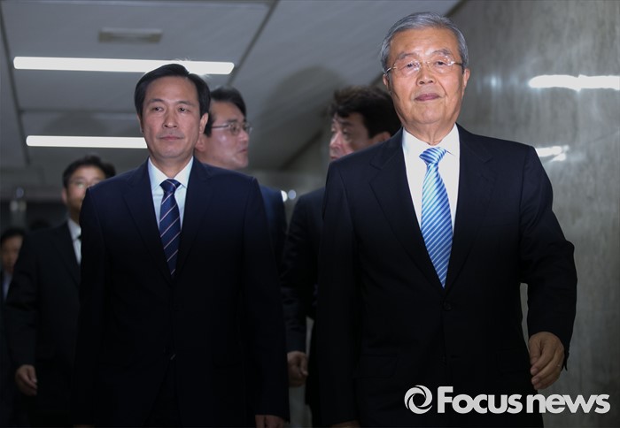 (서울=포커스뉴스) 13일 오전 서울 여의도 국회에서 열린 더불어민주당 비공개 의원총회에 김종인(오른쪽) 비대위 대표, 우상호 원내대표가 입장하고 있다.
