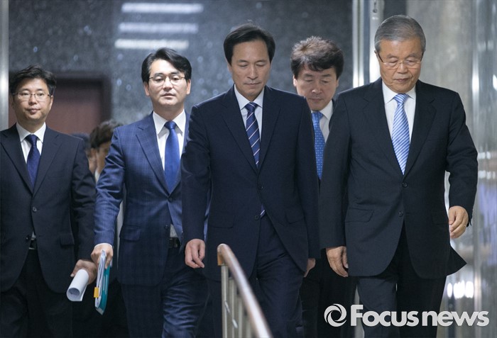 (서울=포커스뉴스) 13일 오전 서울 여의도 국회에서 열린 더불어민주당 비공개 의원총회에 김종인 비대위 대표, 우상호 원내대표가 입장하고 있다.