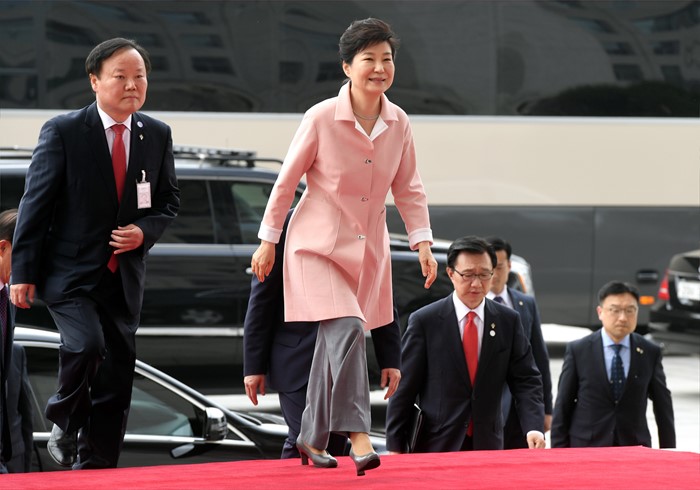 (서울=포커스뉴스) 박근혜 대통령이 13일 오전 서울 여의도 국회에서 열린 20대 국회 개원식 연설을 위해 본청으로 들어서고 있다. 왼쪽은 김재원 정무수석.