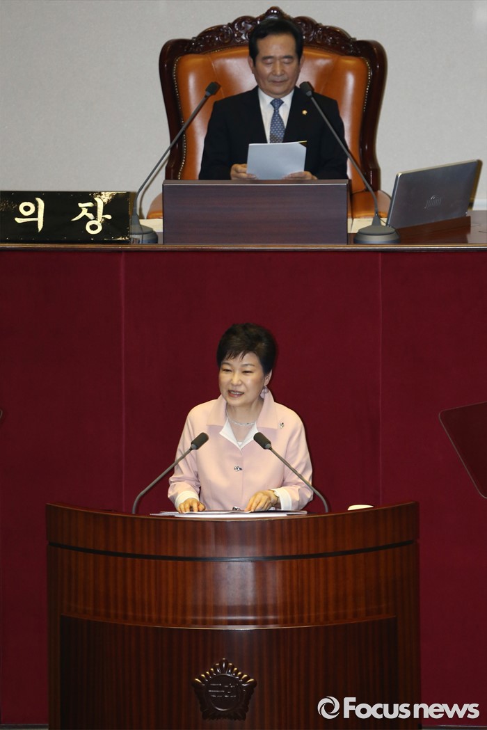 (서울=포커스뉴스) 박근혜 대통령이 13일 오전 서울 여의도 국회에서 열린 20대 국회 개원식에 참석해 연설을 하고 있다.